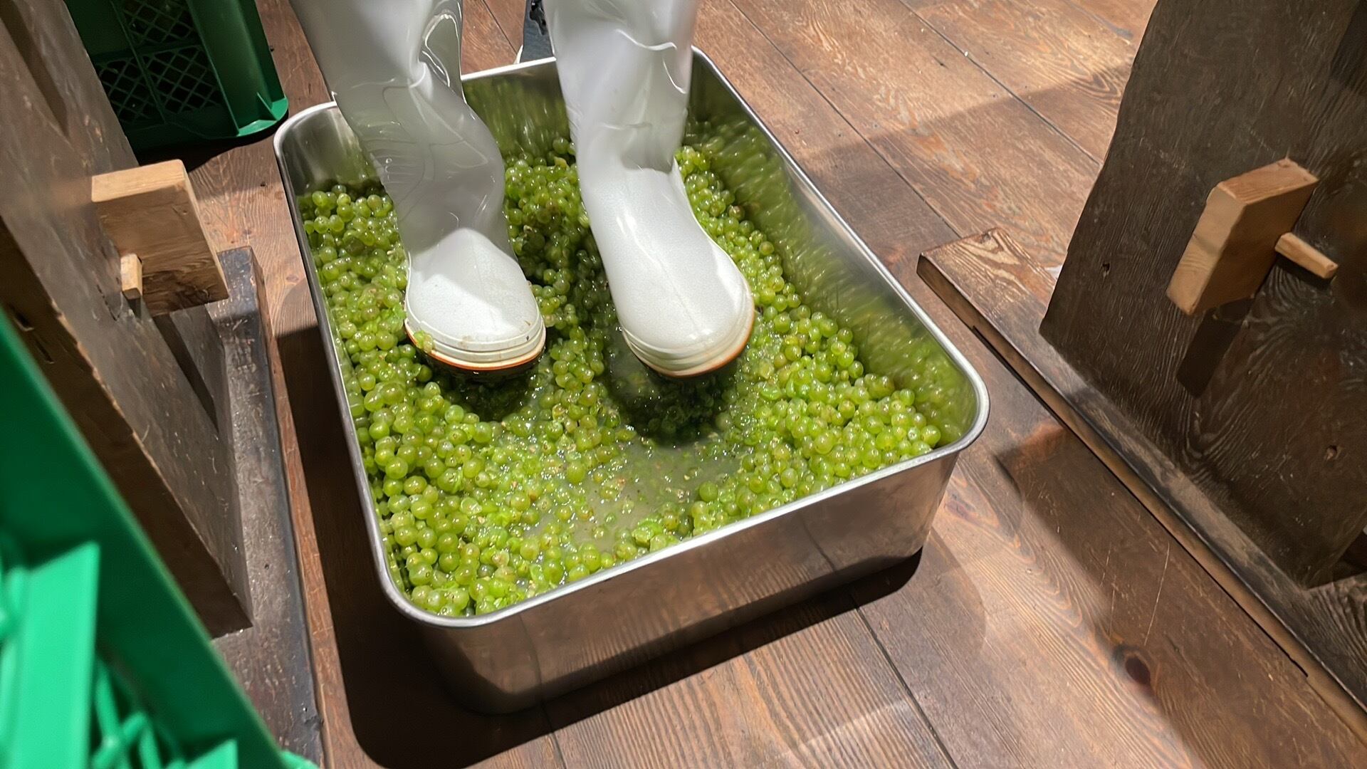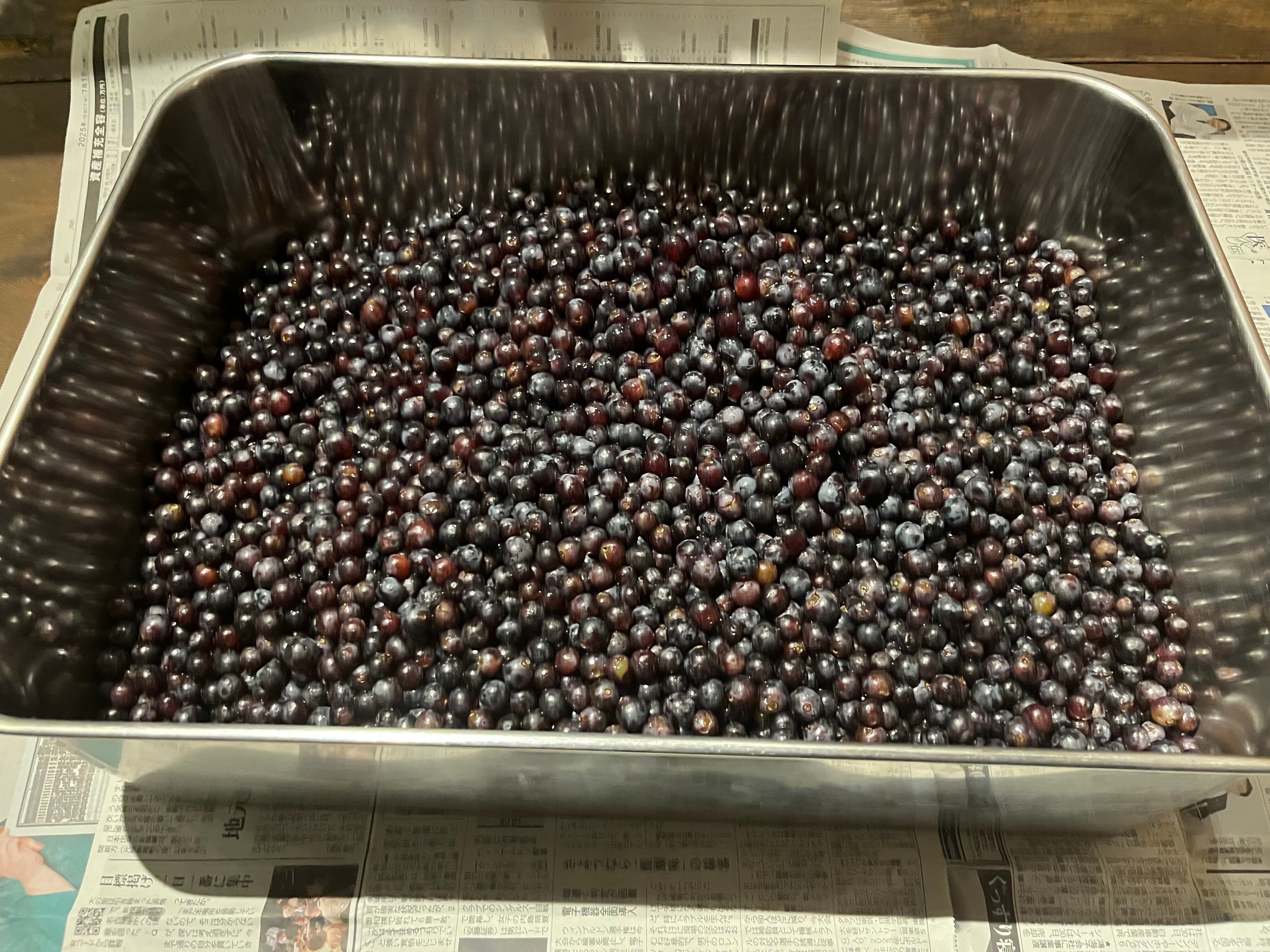 粒だけにしたぶどうをすぐに足踏みでジュースにします。すぐにしないと酸化が始まります。