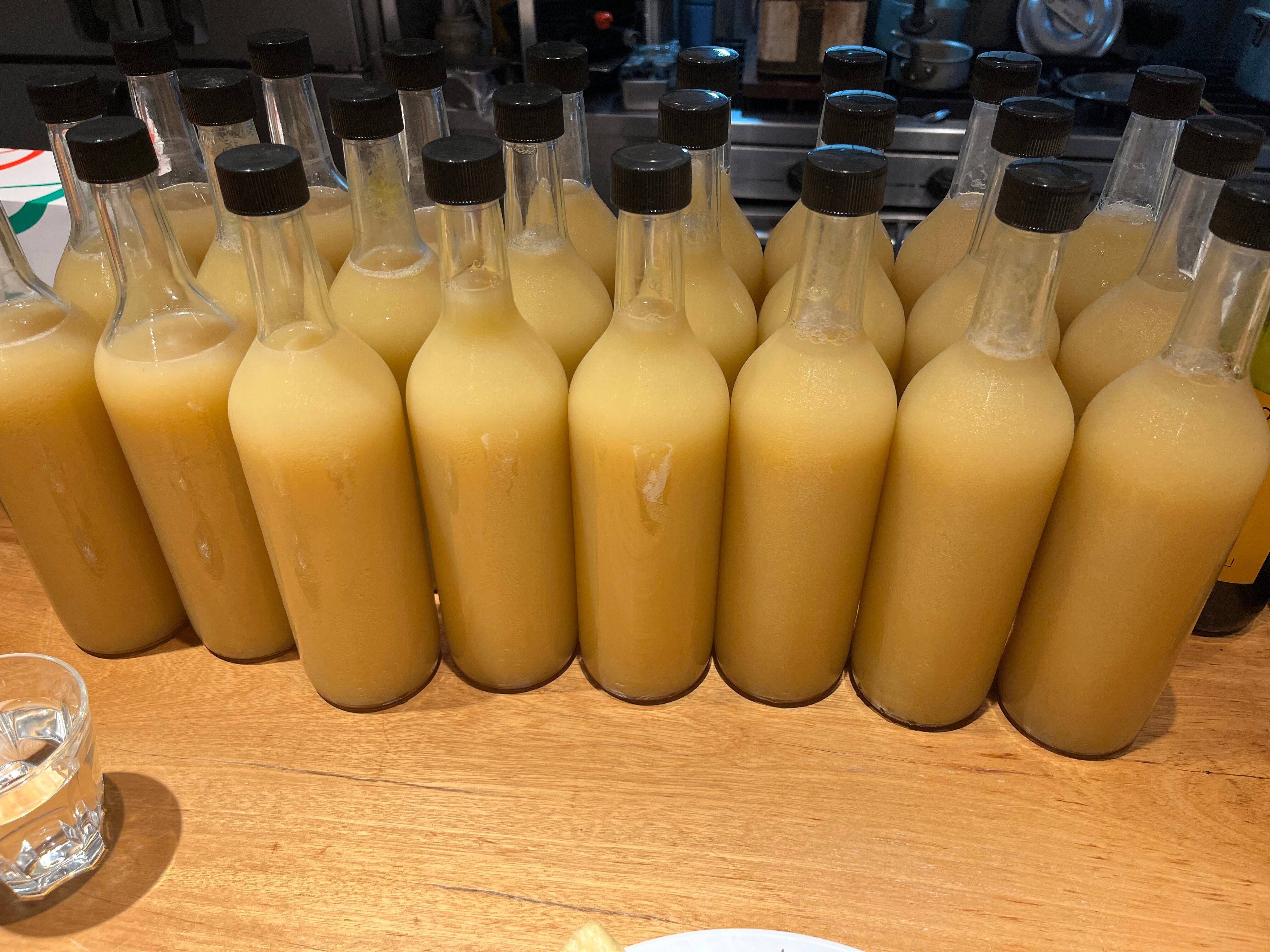 1日後、液体のそこの方に沈殿物ができます。これは、果汁中の固形物や熱によって変化した成分の沈殿です。あと酒石も固まります。これらを入れないように、ぶどうジュースを殺菌したボトルに入れます。入れたあと、キャップを閉めずに、お湯の中に入れ80度で10分殺菌します。